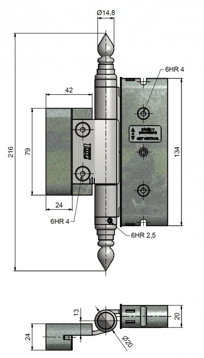 Hinge with decorative ending UR14, we make the hinge on order after agreement. It is determined for exterior doors with rabbet 15 - 18 mm, especially for profile EURO 68 (It is determined for window profile - montage with window template). The hinge is adjustable in three directions, high durability (it was tested for 1 million cycles). Plug is secured against slipping by security screw. Set contains 3 hinges. In case of doors higher than 2000 mm or wider than 1000 mm we recommend adding 4th hinge (V) which is available separately.