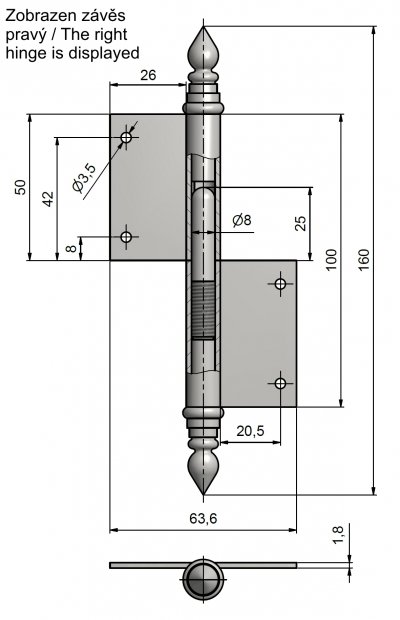 Hinge with decorative ending. It is used for turning connection of window wing and frame.