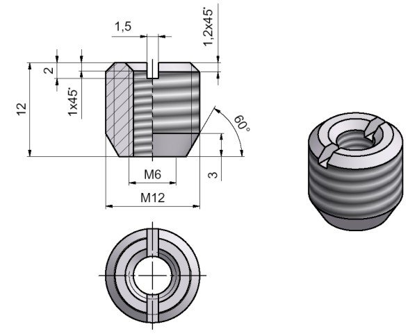 Matice závrtná M12 s vnitřním závitem M6 pro zavrtání do dřeva. K zašroubování plochým šroubovákem. Materiál: Hliník Pro rozebíratelné spojení nábytkových desek pomocí válečkové matice a šroubu.