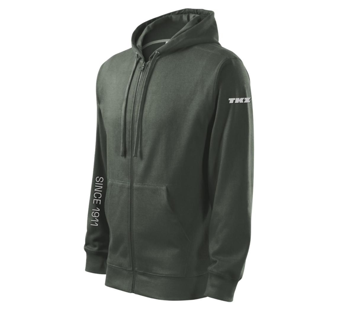 Rovný střih s bočními švy, celopropínací kostěný zip, kapuce s podšívkou, na stažení šňůrkou, vnitřní část průkrčníku začištěna kontrastní páskou, nakládané kapsy ve stylu klokanky, dolní lem a manžety rukávů z žebrového úpletu 2:2 s 5 % elastanu, vnitřní strana počesaná.