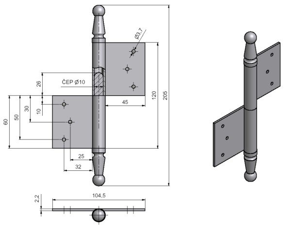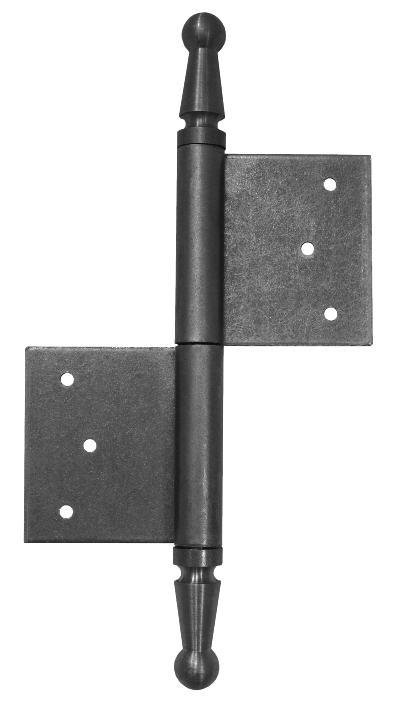 Hinge for turning connection of door and wooden frame. Upper and lower parts are mortised and secured by nails without head. Plug of the hinge is provided with decorative ending UR01. Suitable for reconstruction of old doors.