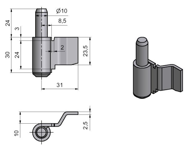 Spodní díl dveřního závěsu, určen pro ocelové zárubně.