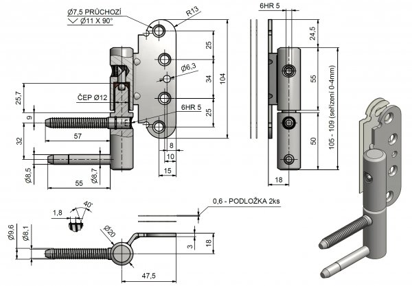 Kompletní závěs řady TRIO umožňující seřízení dveřního křídla ve třech směrech.