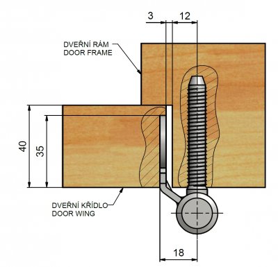 Spodní díl závěsu je zašroubován do dřevěné zárubně. V případě potřeby je možno vrchní díl vypodložit podložkami, které jsou součástí balení (případně lze další přiobjednat samostatně - viz níže).