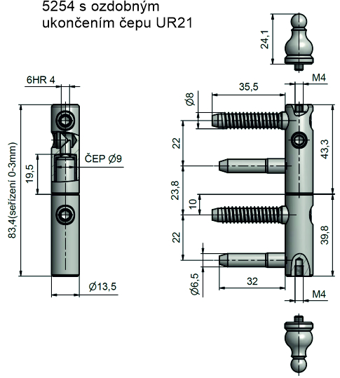 Okenní závěs řady EXPERT s ozdobným ukončením čepu - vyrobíme dle Vašich požadavků na zakázku! (panty jsou dodávány smontované)